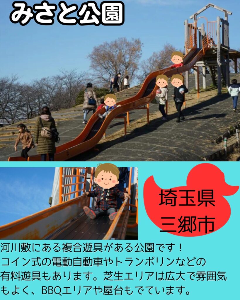 屋内の遊び場ばかり紹介しましたが、天気が良い日は「みさと公園」が最強です。