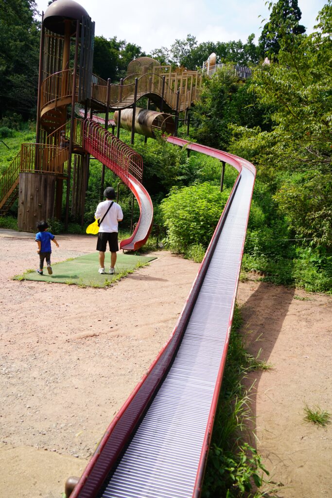 遊具には正面を右に曲がった第2駐車場が近くて便利です。ローラー滑り台などはまだ使用禁止となってるため、注意です。ローラー滑り台は下りだけでなく、のぼる際にもアスレチックがあり、アトラクションが難しい場合は階段で回避できるように楽しめる仕組みがあり、良くできたアスレチックです。