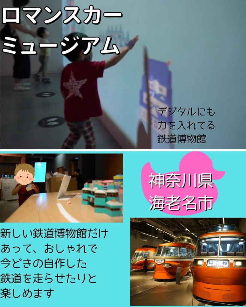 小田急線海老名駅の改札を出てすぐ。歴代ロマンスカーの展示はもちろん、木でできたロマンスカーの中で遊べる「キッズパーク」がおしゃれで楽しい!
