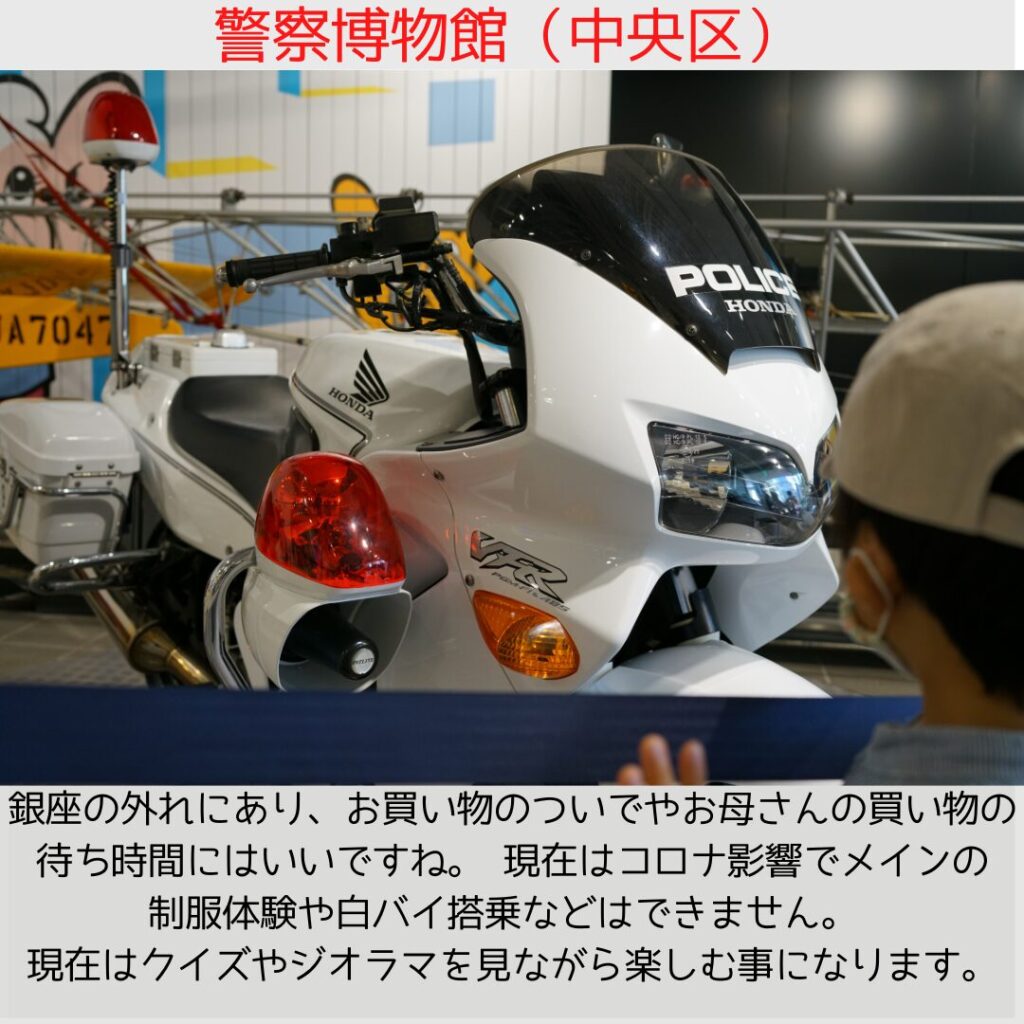 銀座・京橋エリアにある、警察の博物館。入り口にパトカーの展示があり、子供用の警察官制服を着て記念撮影ができます。