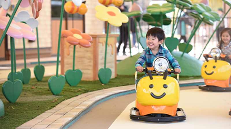 3歳から一人で乗れるバイク型アトラクションです。アクセル操作がシンプルなので、初めての「運転」に最適です。